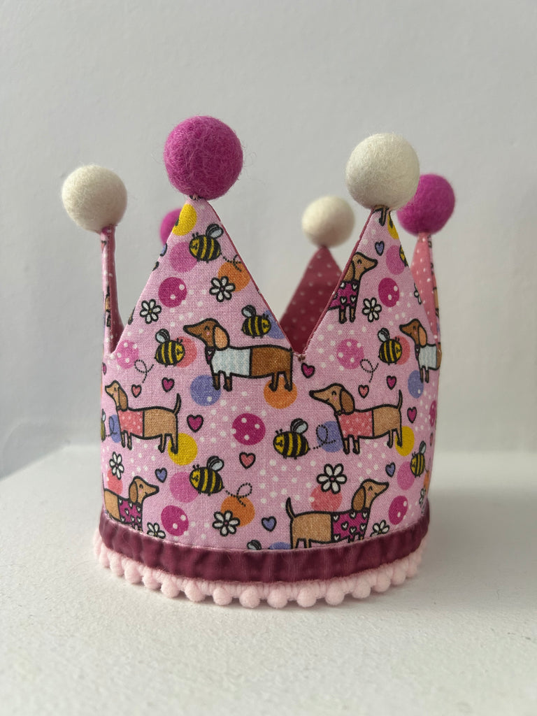 Hand made Birthday Crown. Sewn with my beautiful bee happy dachshunds pink design printed onto organic cotton and lined with OEKO-TEX®️ STANDARD 100 pink polka dot cotton. This has a baby pink pompom edge and a pink velvet ribbon trim. This hat also has 100% merino wool pompoms sewn onto the points of the crown.