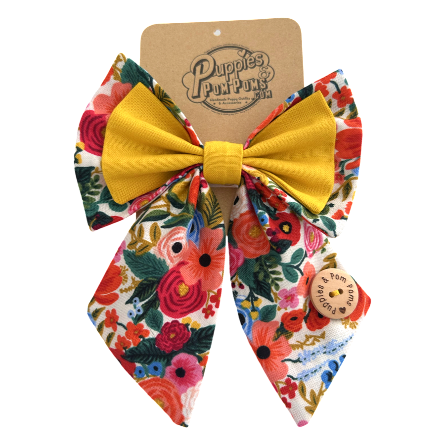 These Stunning Double Sailer Bows are made with this absolutely beautiful floral print fabric by Rifle Paper fabrics. I have doubled the bow up with this bright Sunshine yellow cotton to really make the colours pop and to give your dog an extra luxurious look.