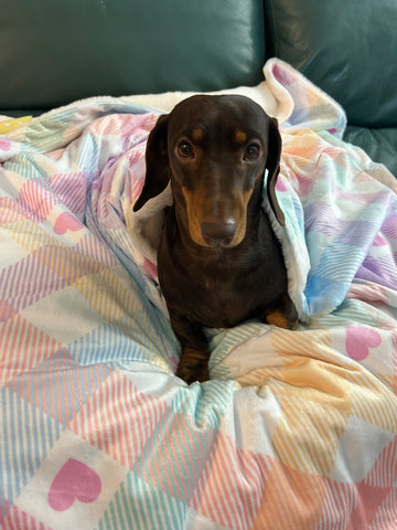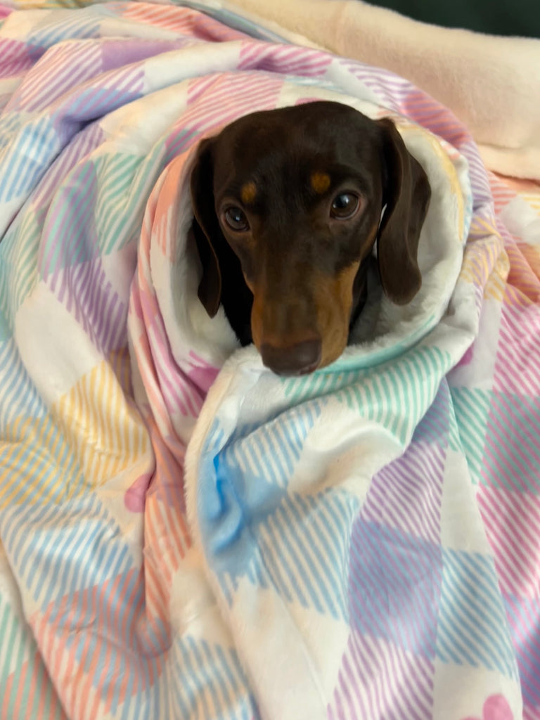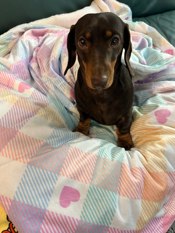 A Super soft and very cosy luxurious blanket with my pretty pastel vichy and pink love hearts design printed onto a soft plush minky flannel front and a reverse lined with faux rabbit fur. A short pile, fluffy and silky soft fur, to keep you and your dog warm and very snuggly. These also have a waterproof layer inside to protect your bed or sofa from any spillages your puppy makes.