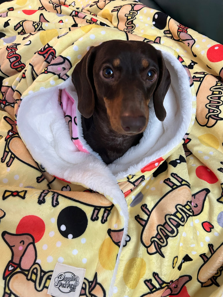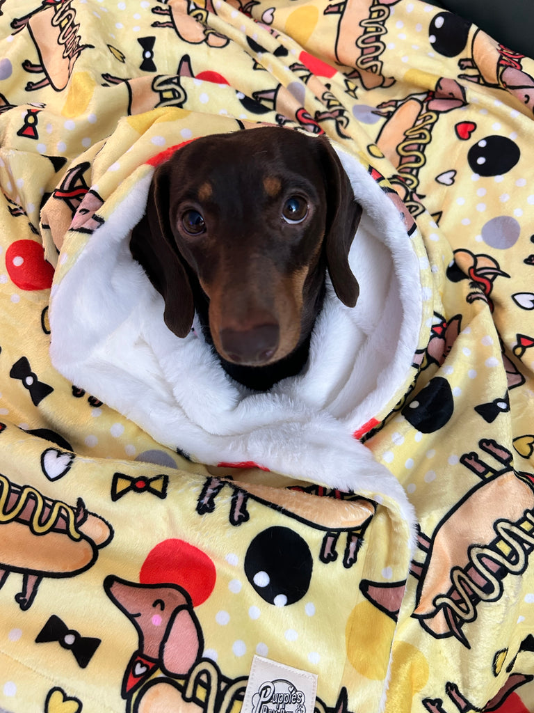 A Super soft and very cosy luxurious blanket with my ever so cute dachshund design printed onto a soft plush minky flannel front and a reverse lined with faux rabbit fur. A short pile, fluffy and silky soft fur, to keep you and your dog warm and very snuggly.